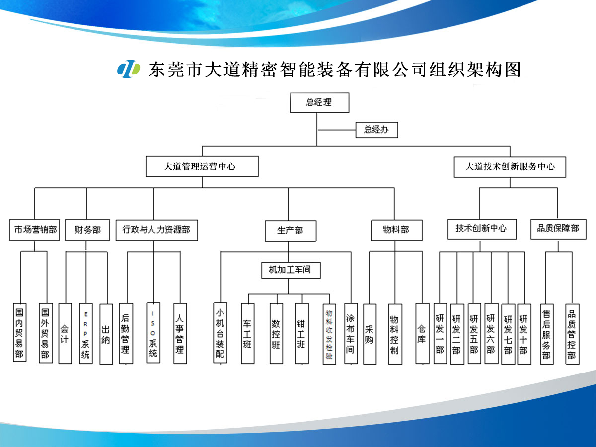大道精密成立于2019年,公司注冊(cè)資本1000萬(wàn)元,擁有辦公室、廠房等18,000多平方米。已通過(guò)ISO9001:2015國(guó)際質(zhì)量管理體系認(rèn)證,擁有國(guó)家各類專利共計(jì)58項(xiàng),獲得“中國(guó)大道.商標(biāo)”和“一帶一路十周年 .國(guó)禮品牌”等榮譽(yù)稱號(hào),屬于國(guó)家高新技術(shù)企業(yè),專精特新中小企業(yè)。2023年4月成立了“東莞市大道精密智能裝備有限公司關(guān)心下一代工作委員會(huì)”,是東莞市企石鎮(zhèn)工商聯(lián)副會(huì)長(zhǎng)單位、東莞市企石鎮(zhèn)文學(xué)藝術(shù)界聯(lián)合會(huì)副主席單位、東莞市環(huán)保包裝行業(yè)協(xié)會(huì)副會(huì)長(zhǎng)單位、東莞市數(shù)控裝備行業(yè)協(xié)會(huì)第二屆會(huì)長(zhǎng)單位、廣東省包裝技術(shù)協(xié)會(huì)常務(wù)理事單位、廣東省膠粘劑行業(yè)協(xié)會(huì)理事單位、國(guó)家標(biāo)準(zhǔn)《機(jī)械安全中安全防護(hù)授權(quán)系統(tǒng)的基本要求》起草單位。